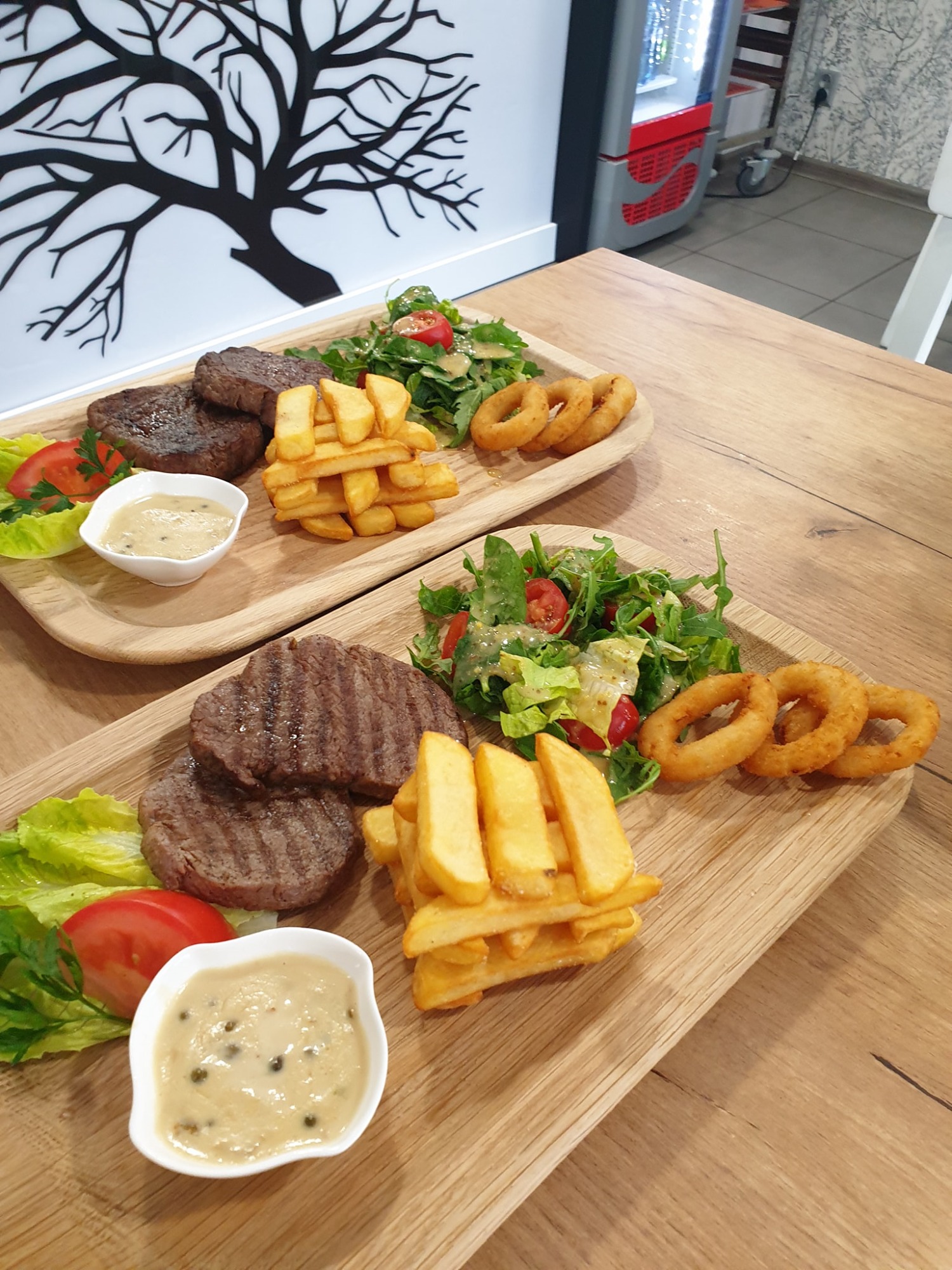 Frytki, mięso, mozzarella zapiekana, sosy. -