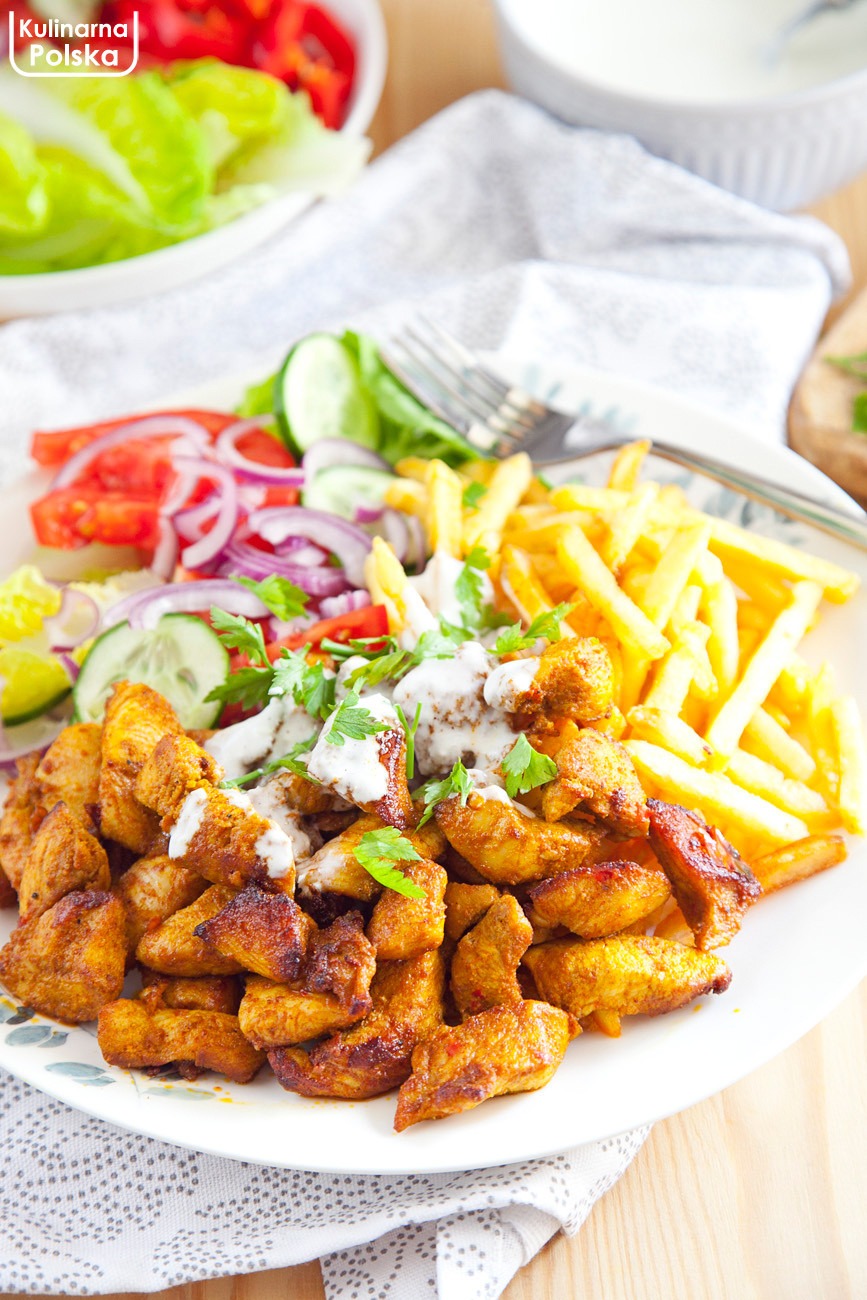 Z sosem miodowo - musztardowym, frytki, surówka. -